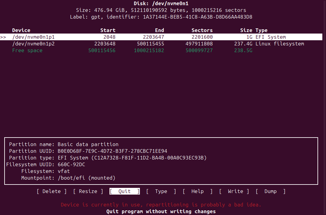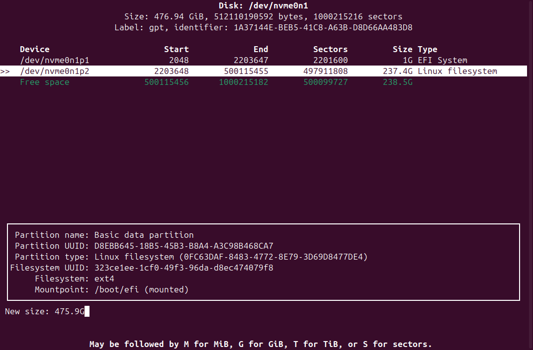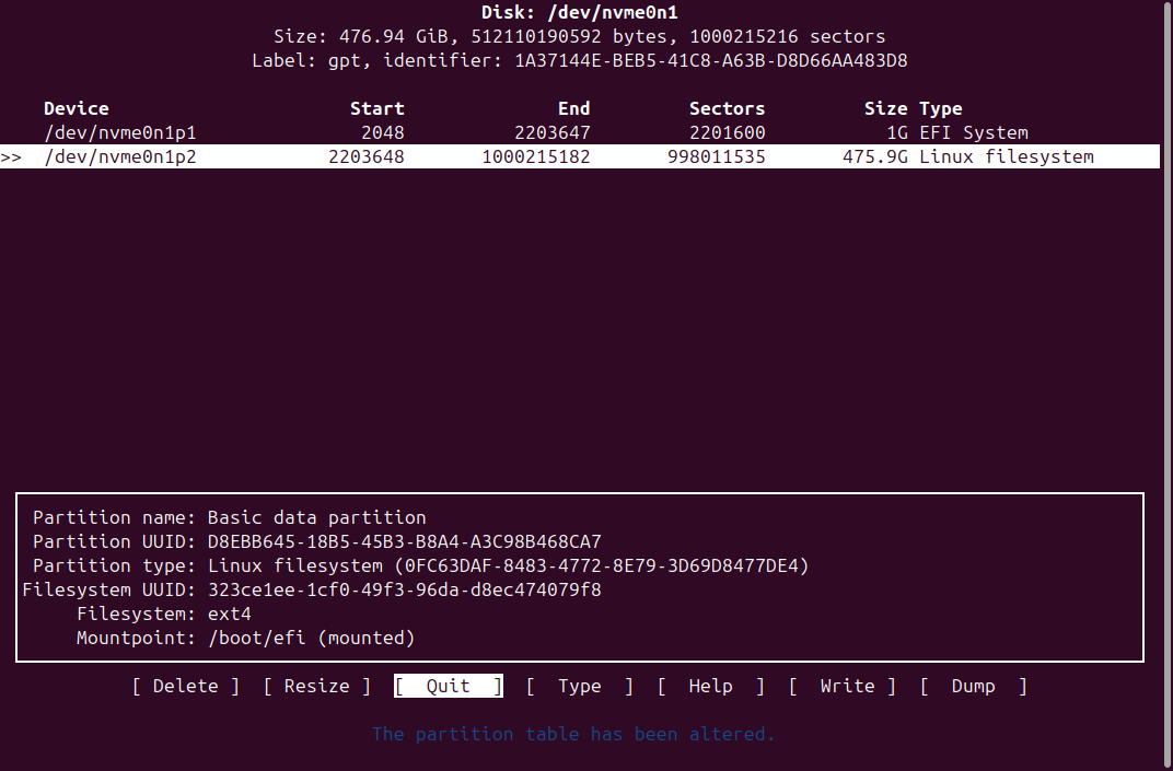 sudo cfdisk /dev/nvme0n1. - Select the partition (e.g.,
