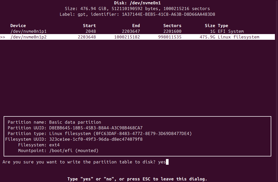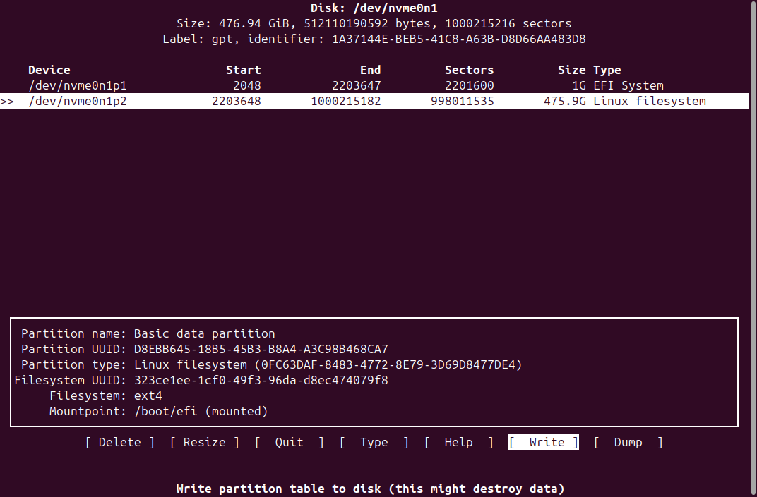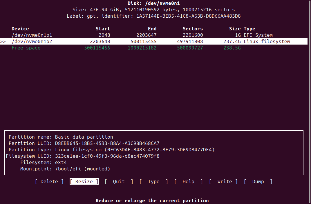 /dev/nvme0n1p1or nvme0n1p2), choose Resize, and confirm the new size. - Select Write, type